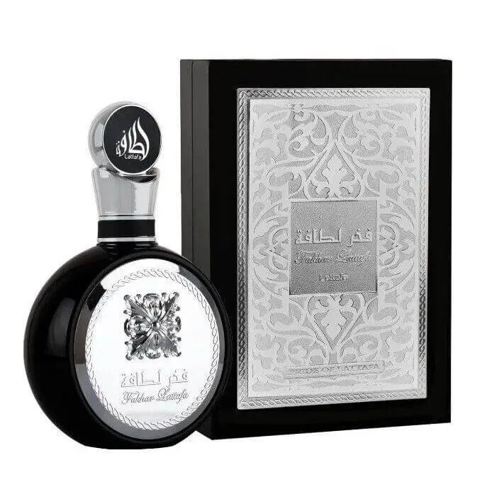 Fakhar Lattafa (Pride of Lattafa) Black / Silver Perfume / Eau de Parfume by Lattafa Perfumes is an Amber fragrance for men. This is a new fragrance. Fakhar Black / Silver was launched in 2021. The top notes are Apple, Bergamot and Ginger; the middle notes are Lavender, Sage, Juniper Berries and Geranium; the base notes are Tonka Bean, Amberwood, Cedar and Vetiver.